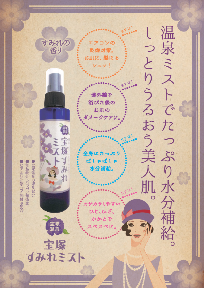 古くからの歴史をもち、本市になくてはならない観光資源である「宝塚温泉」。明治の歌人与謝野晶子も愛でたとして知られています。その宝塚温泉の魅力をPRするため、すでに販売している入浴剤は大変好評をいただいていますが、今回は第2弾として、宝塚温泉の源泉を実際に配合し、より高い効果が期待できる宝塚すみれミストを販売します。