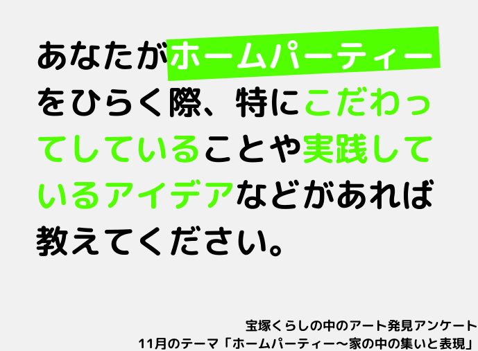 お知らせ 2021/11/01 くらしの中の文化と芸術に関する第3回アンケートを行います 「くらしの中のアート発見プロジェクト」では、日々の暮らしの中にある、小さな表現活動、文化資産、交流の場など、身の回りの文化と芸術の実態などについてアンケートを行います。第3回テーマ「ホームパーティー~家の中の集いと表現~」対象:宝塚市内にお住まいの方期間:11月1日(月)~30日(火)アンケートはこちらhttps://docs.google.com/forms/d/e/1FAIpQLSfE4OWS43w8P3hE00pB4jcocaSQq8uwbVcm819dMlTjfEtCdw/viewformプロジェクトの詳細はこちらhttps://kanko-takarazuka.jp/trad/event/detail.php?id=11