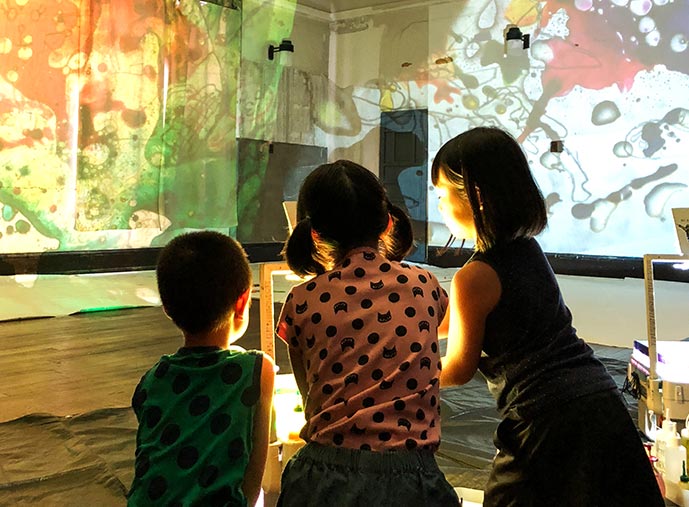 オープニングイベントで、プロジェクションアートと音楽とダンスによるパフォーマンスをしました。光と音と身体。3つのちがったメディアが「混ざって」、キューブホールいっぱいに物語が広がりました。