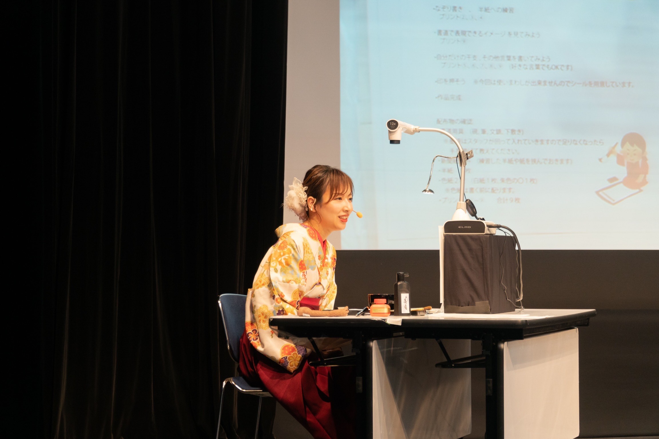 ワークショップの冒頭には、青柳さんと宝塚市のゆかりや書道を始めたきっかけなどをお話しいただき、イベント申込者から寄せられた質問にも答えていただきました。ワークショップが始まると、小さなお子様から大人まで、皆さんが真剣な表情で作品作りに取り組まれていたのが印象的でした。
